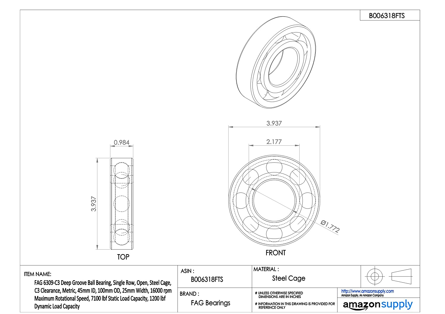 FAG 6309-C3 Deep Groove Ball Bearing, Single Row, Open, Steel Cage, C3 Clearance, Metric, 45mm ID, 100mm OD, 25mm Width, 16000 rpm Maximum Rotational Speed, 7100 lbf Static Load Capacity, 1200 lbf Dynamic Load Capacity